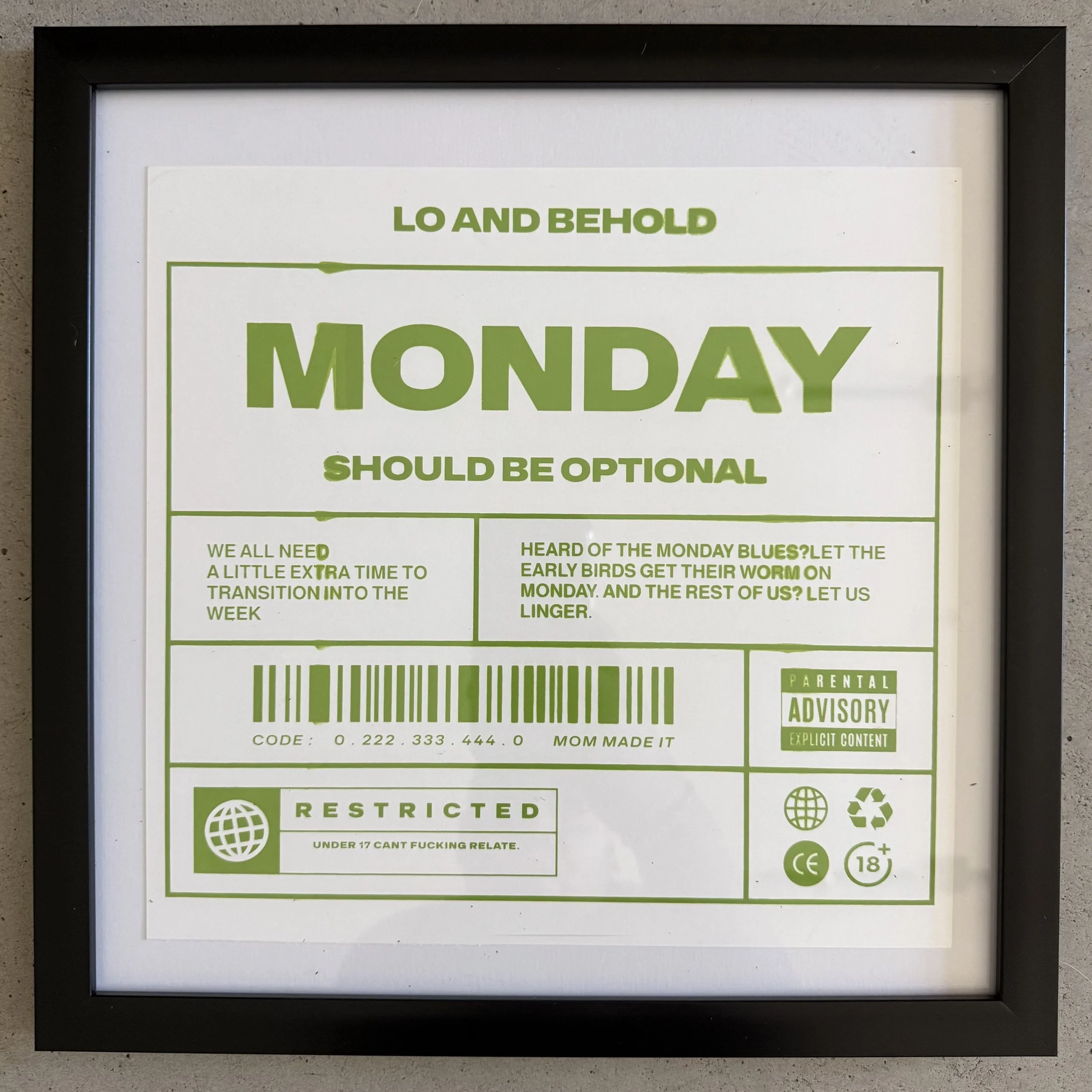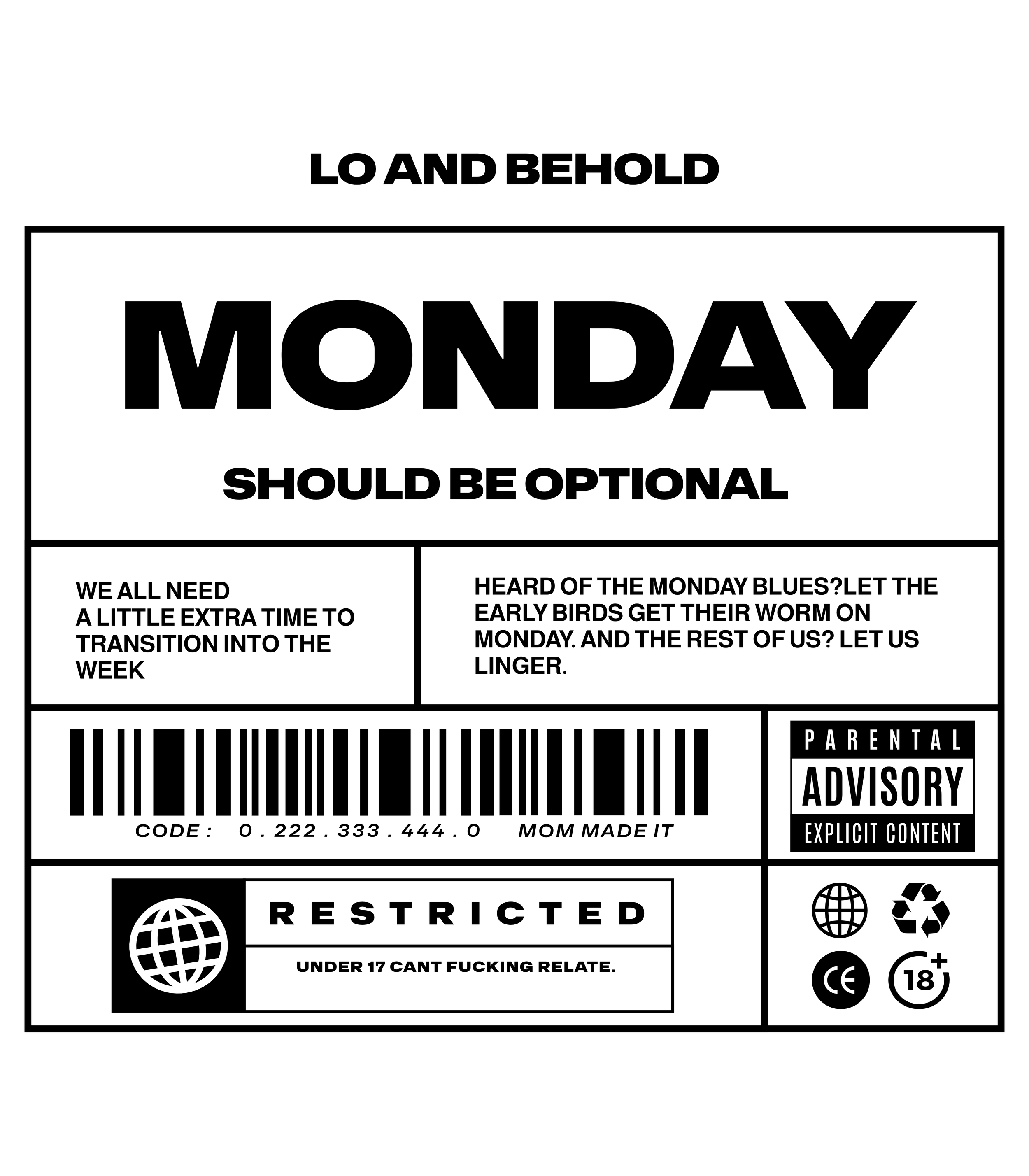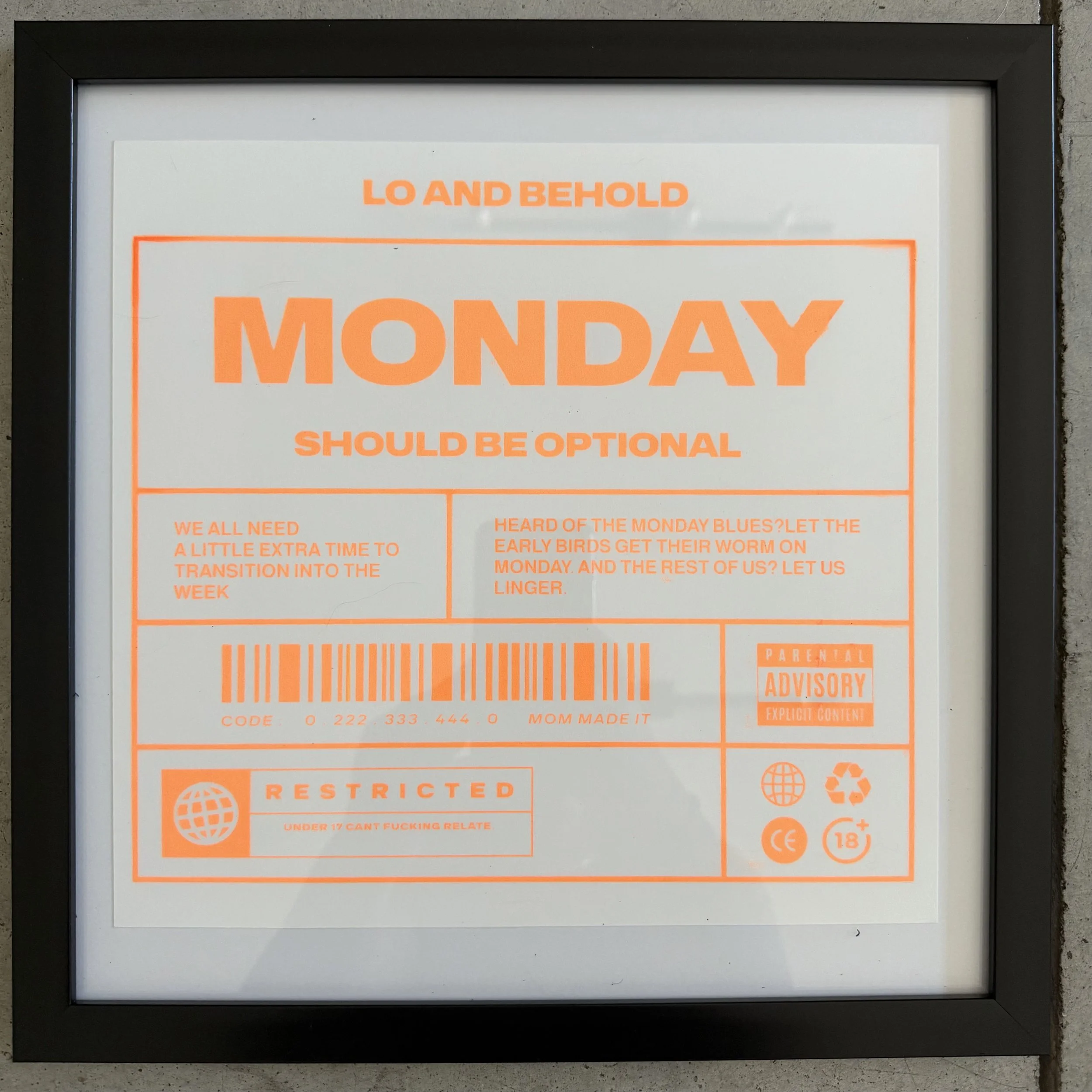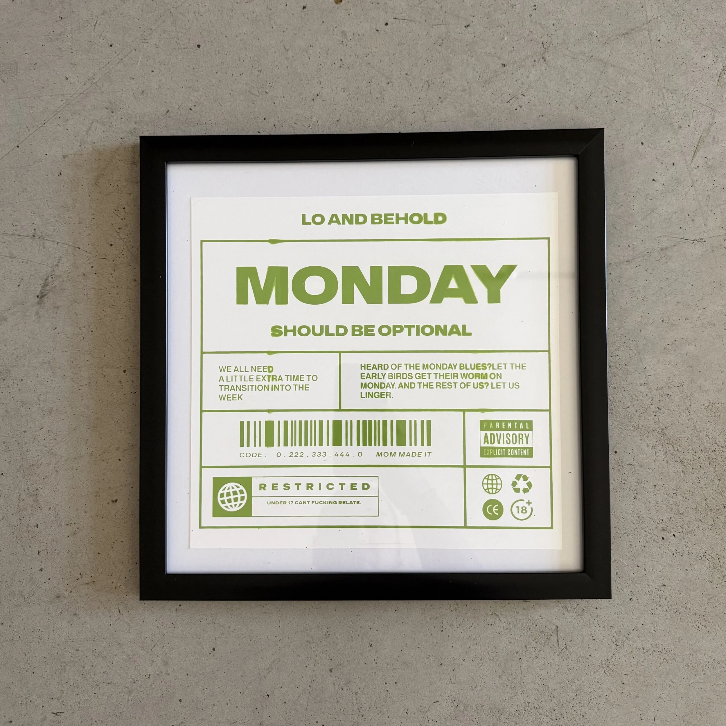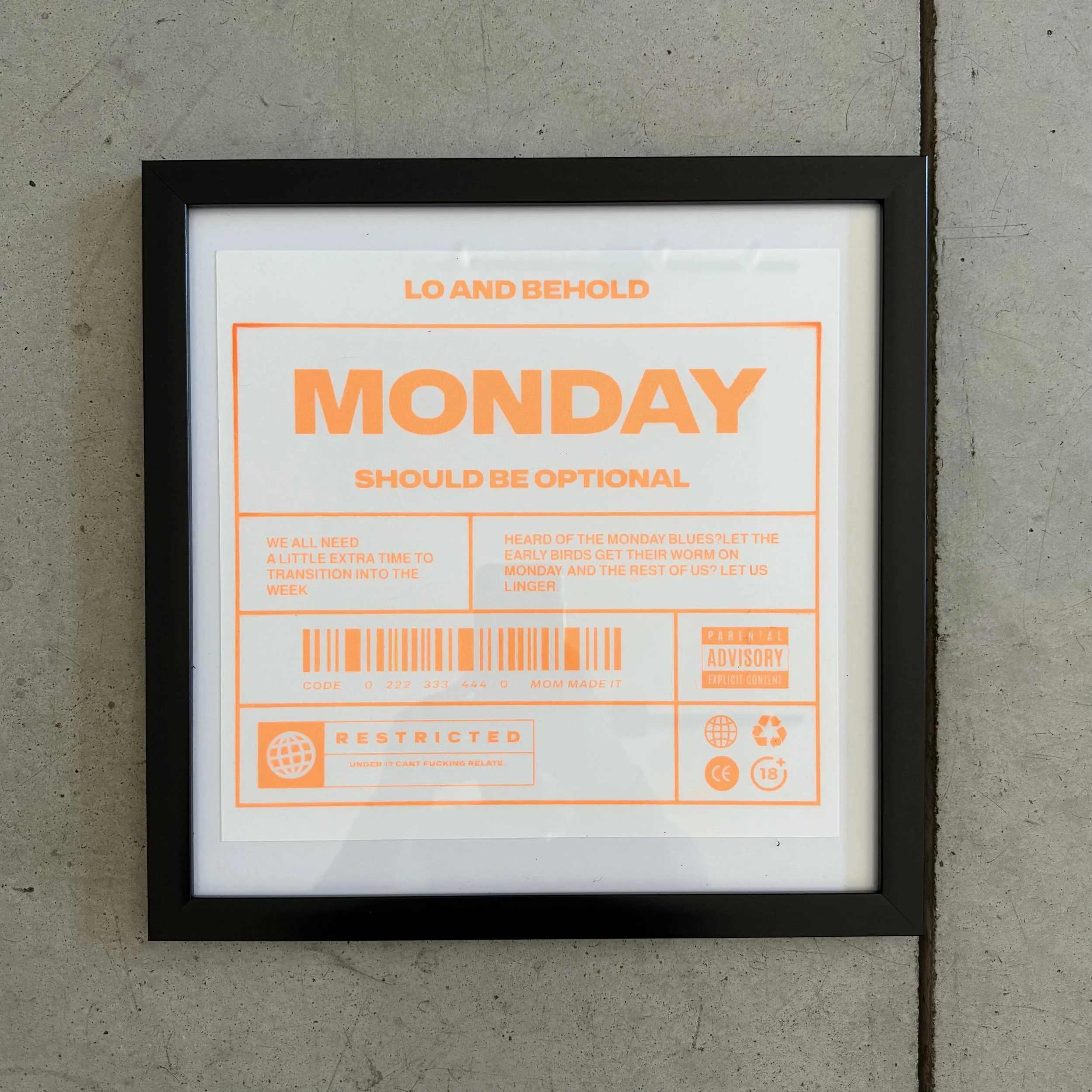 Shop Categories: All New Arrivals Tees Hoodies Bottoms Accessories Prints Shop All New Arrivals Tees Hoodies Bottoms Accessories Prints Monday Tee [Pre-Order] $44.44 Shameless Tee [Pre-Order] $44.44 Name Tag Sticker $2.22 F Bomb Sticker $2.22 Hand-Pulled Thrifted Tee $33.33 Hand-Pulled Thrifted Tee $22.22 Hand-Pulled Thrifted Tee $22.22 Hand-Pulled Thrifted Tee $33.33 Hand-Pulled Thrifted Tee $22.22 Hand-Pulled Thrifted Tee $22.22 Hand-Pulled Thrifted Tee $22.22 3D Logo Sticker $2.22 Framed Hand-Pulled Monday Prints $22.22